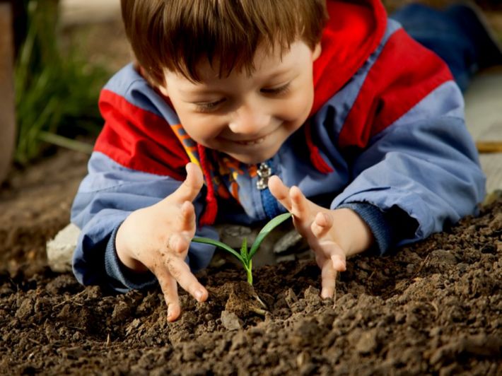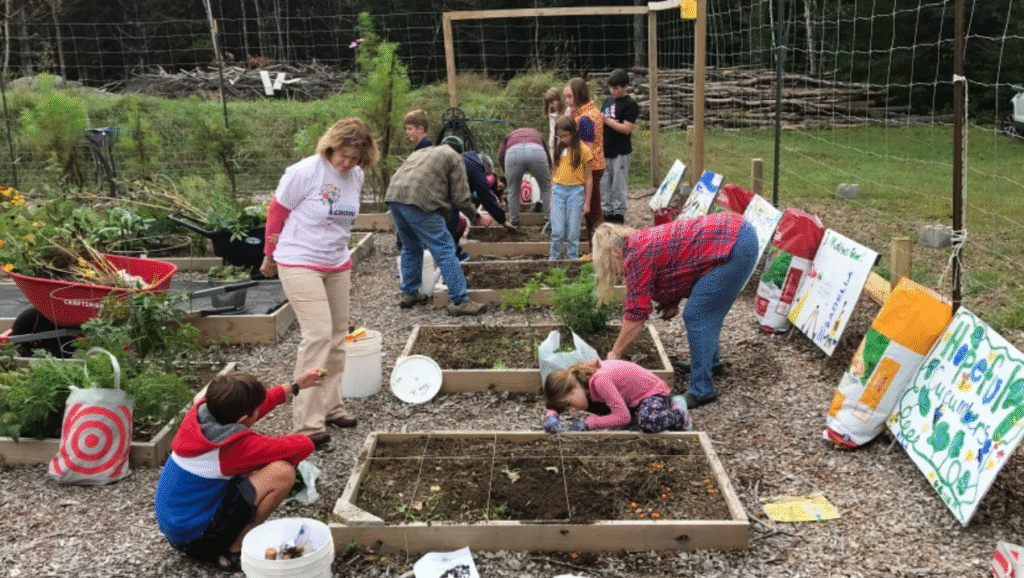 Green areas and gardens where kids plant, harvest, and learn about sustainability.